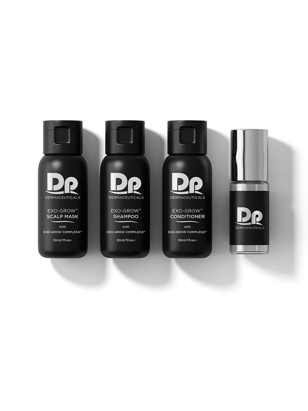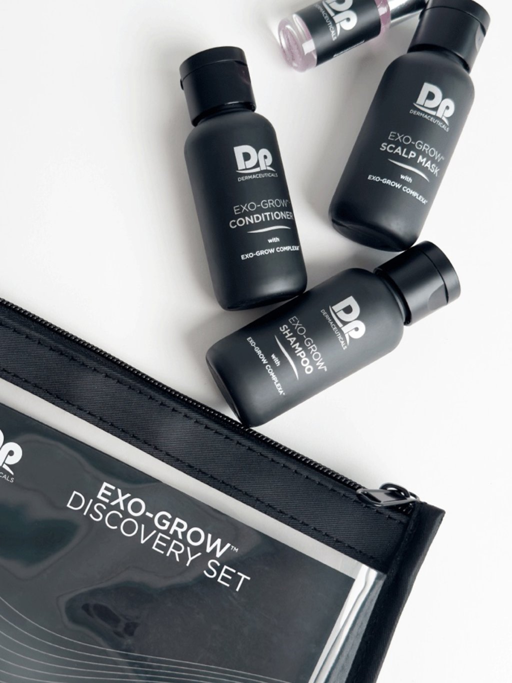 Každá receptura Dp Dermaceuticals EXO-GROW™ je vytvořena z patentované směsi ingrediencí, pečlivě vybraných pro zlepšení zdraví pokožky hlavy, zvýšení kvality vlasů a snížení jejich vypadávání. Tyto přípravky jsou navrženy tak, aby se používaly společně – kombinace jejich jedinečných účinků zesiluje výsledky růstu vlasů.