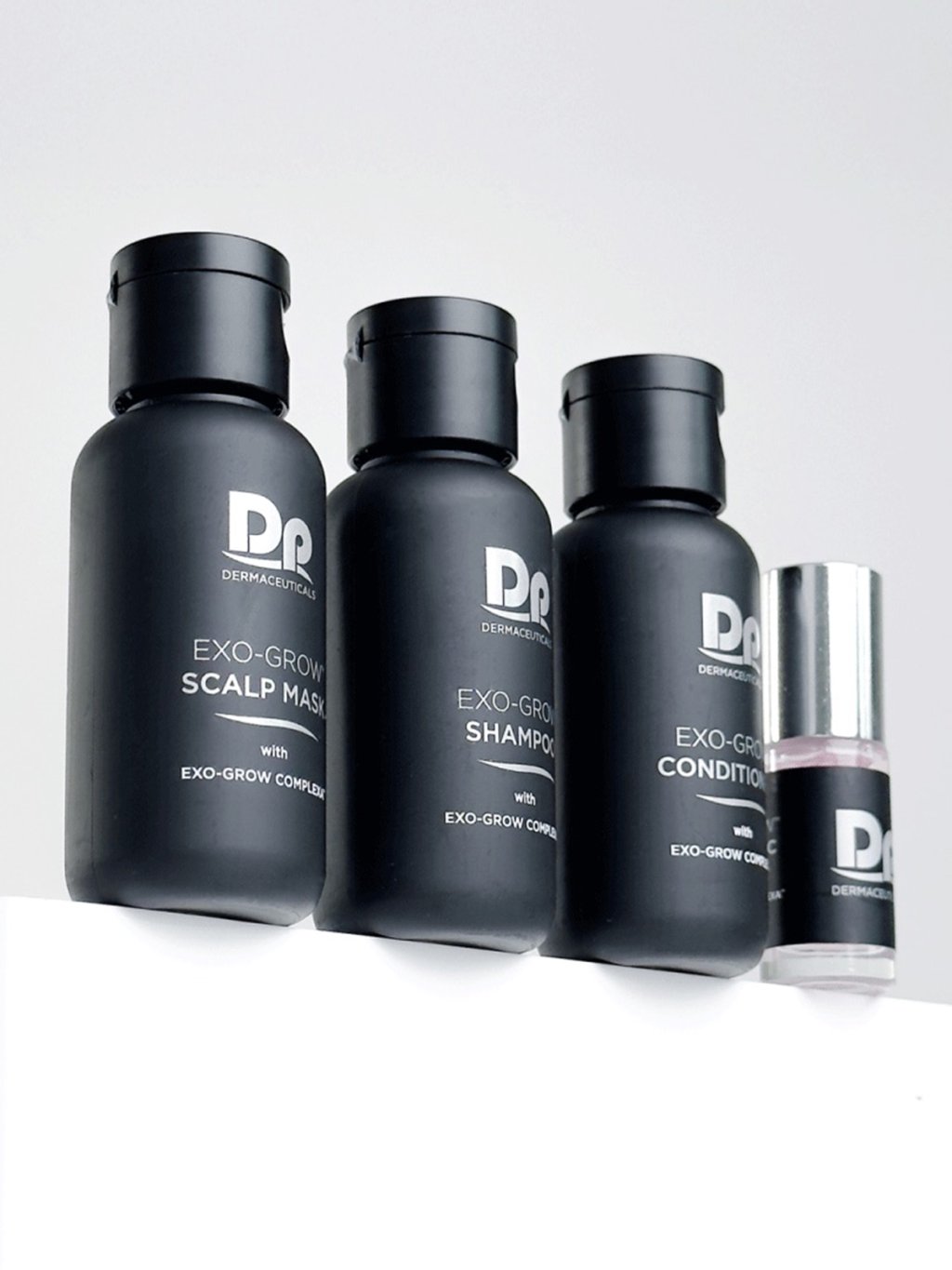 - EXO-GROW HAIR TONIC™ 5 ml, který se zaměřuje na vypadávání vlasů přímo u kořínků díky silné technologii exozomů. Tato bioaktivní formule stimuluje folikuly, zlepšuje vlasový cyklus a pomáhá minimalizovat ztrátu vlasů