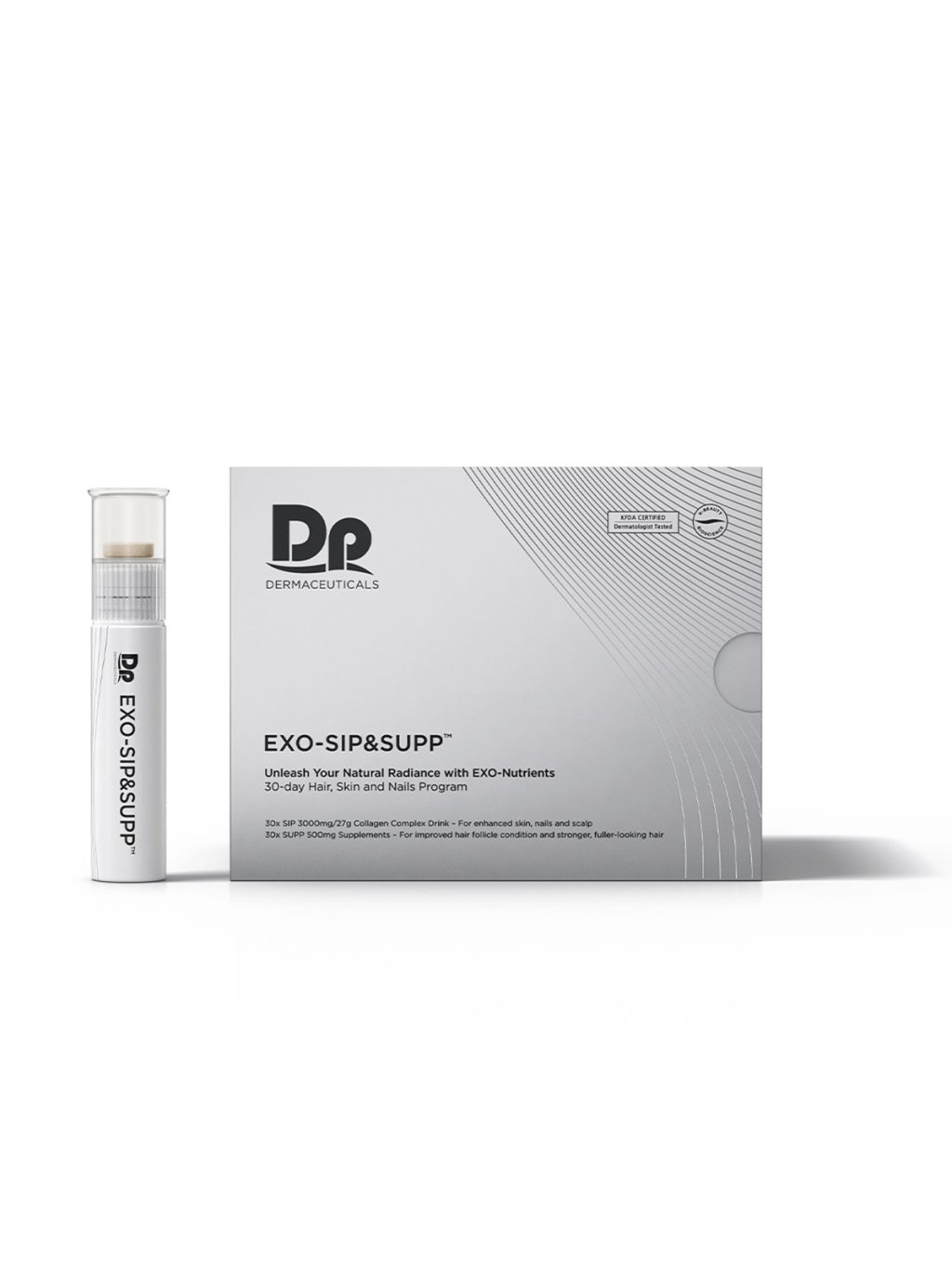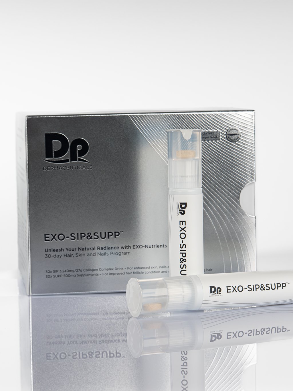 EXO SIP&SUPP představuje unikátní doplněk stravy s dvojitým systémem užívání – každá dávka kombinuje tabletu a kolagenový nápoj. Díky této synergii dodává tělu přesně vyvážené množství aktivních látek, které působí zevnitř na kvalitu pokožky, vlasů i nehtů. Podporuje buněčnou energii, regeneraci a ochranu před oxidačním stresem. Složení vychází z nejnovějších poznatků nutrikosmetiky a využívá pokročilé technologie HylaFuse™ pro postupné uvolňování účinných látek.