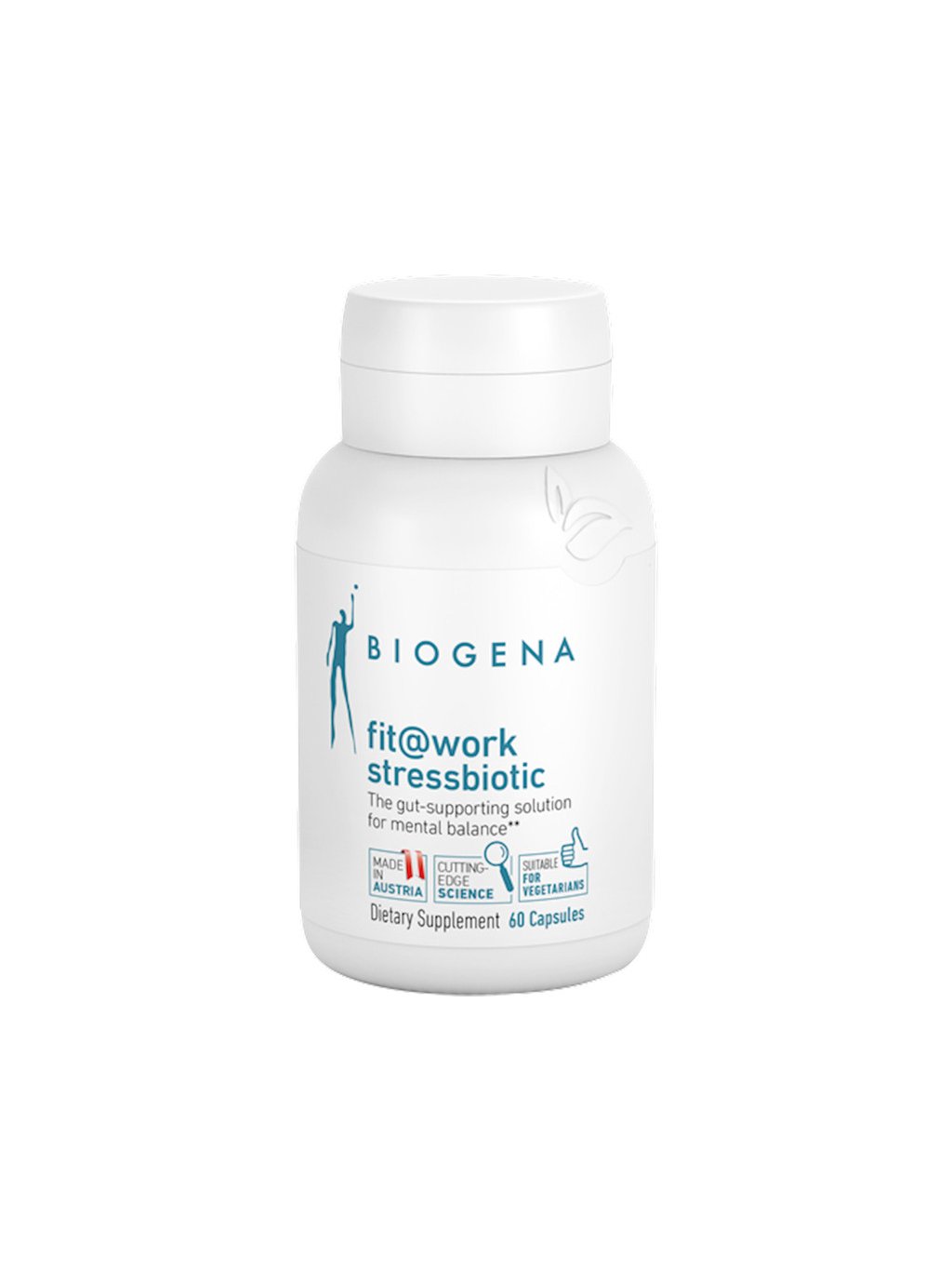 fit@work® Stressbiotic je založen na značkové surovině Probiostress™ – cílené kombinaci lakto- a bifidobakterií s extraktem ze šafránu – doplněné vitamíny B2 a C, které podporují funkci nervového systému a energetický metabolismus. Vitamín C také přispívá k normální duševní funkci. Probiostress™ kombinuje bakteriální kmeny Lactobacillus helveticus R0052 a Bifidobacterium longum R0175 s vysoce kvalitním extraktem ze šafránu. V jedné kapsli jsou obsaženy 3 miliardy reprodukčních bakterií, které mohou kolonizovat střeva a tím přispívat k celkové pohodě. Obsažený šafrán není jen cenným kořením, ale v Orientu se tradičně používá k podpoře relaxace a pomáhá udržovat pozitivní náladu.