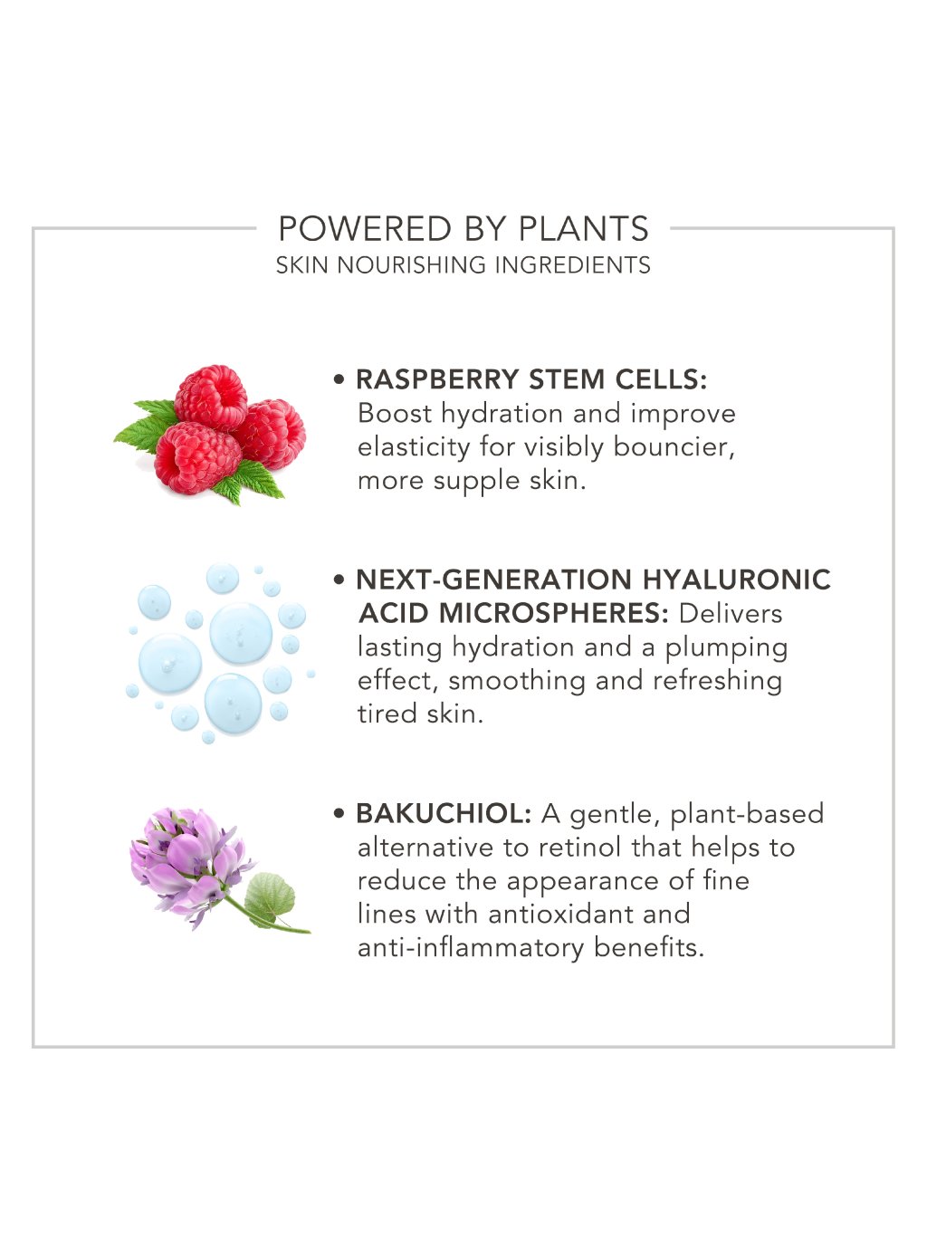 - Obsahuje kmenové buňky malin, ty zvyšují hydrataci a pružnost, obnovují elasticitu a vláčnost unavené pleti a chrání ji před stresovými faktory prostředí